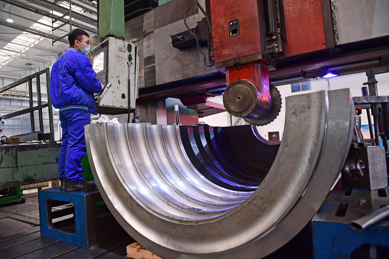 在沈陽鼓風機集團車間,工人通過屏幕操作機器加工産品内機殼(2020年3月16日攝)。新華社記者 楊青 攝